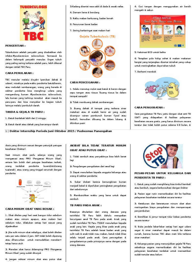 Contoh leaflet tbc. Memiliki asuransi kesehatan tentu menjadi satu keuntungan tersendiri bagi seseorang agar jangan sampai penanganan dan pengobatan menjadi terhambat. TBC menular melalui droplet percikan dahak di udara misalnya pada waktu penderita batukbersin CARA PENCEGAHAN. Contoh Menu Sehari ETPT II Pagi Nasi Telur dadar Daging semur Ketimun tomat iris Susu Pukul 1000 Bubur Kacang hijau Susu Siang Nasi Ikan bumbu acar Ayam goreng Tempe bacem Sayur asam Pepaya Pukul 1600 Susu Malam Nasi Daging empal Telur balado Sup sayuran Pisang Pukul 2100.
