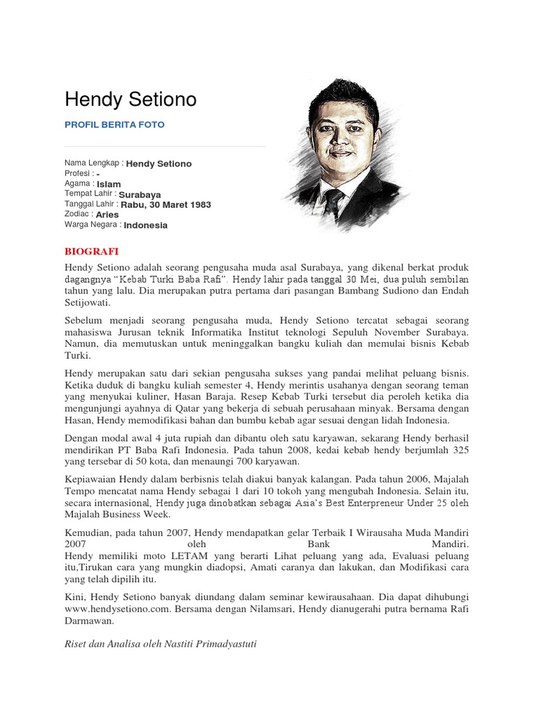 Pendidikan SD-nya ia habiskan di Bontang dan final di Amerika Serikat. Hendy Setiono misalnya menemukan ide bisnis setelah dirinya mencoba makanan khas T. PROFIL PENGUSAHA MUDA SUKSES INDONESIA TUGAS MATA KULIAH KEWIRAUSAHAAN OLEH RENDY FRANATA 1014071009 JURUSAN TEKNIK PERTANIAN FAKULTAS PERTANIAN UNIVERSITAS LAMPUNG BANDAR LAMPUNG 2013 HENDY SETIONO KEBAB TURKI BABA RAFI Nama Lengkap.